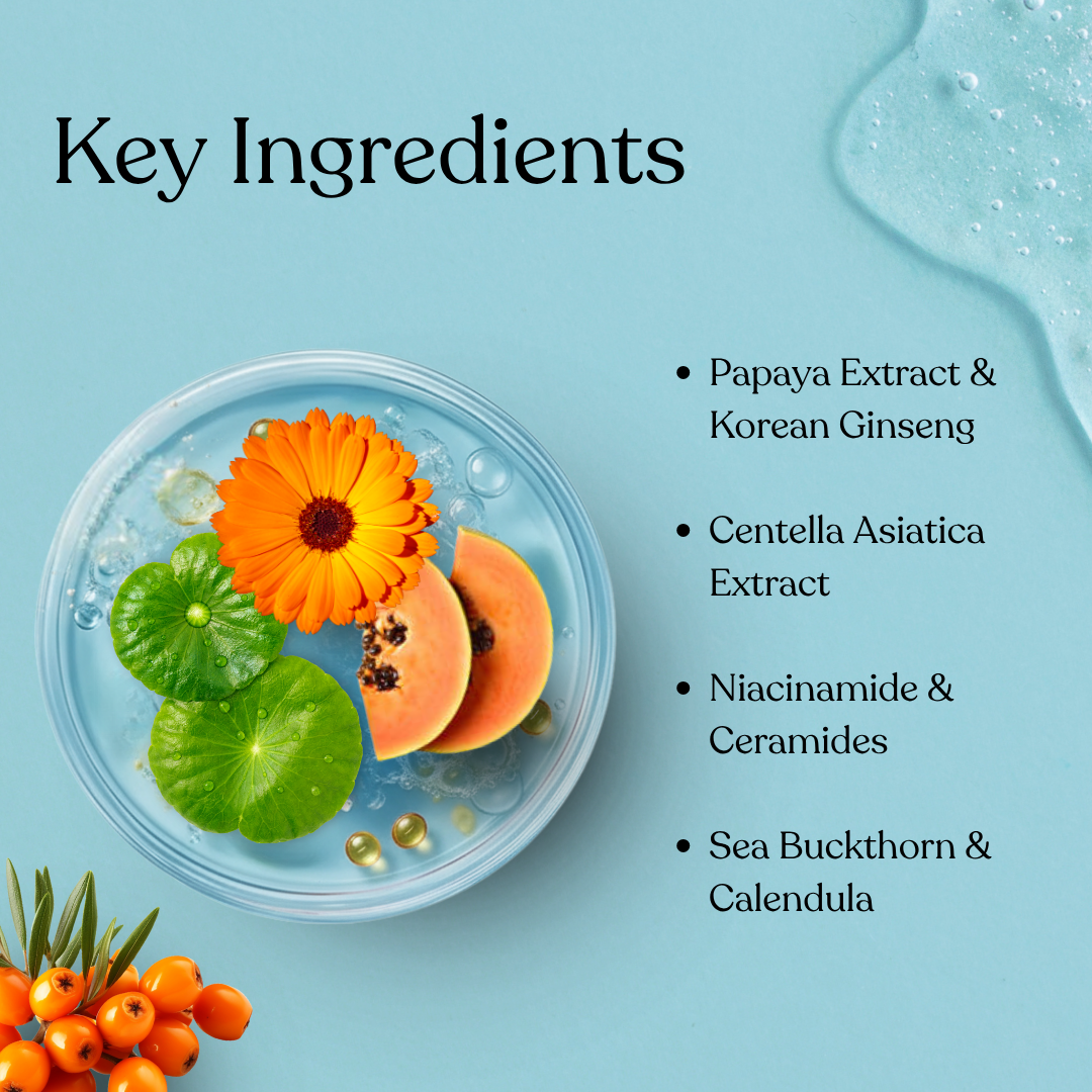 Purified Water, Glycerin, Butylene Glycol, Hydrolysed Lecithin & Lecithin, Centella Asiatica (Cica) Extract, Ginseng Extract, Sea Buckthorn Extract, Tea Tree, Niacinamide, Vitamin E Acetate, Phenoxyethanol, Ethylhexylglycerin. (Match exact INCI from your sheet.)