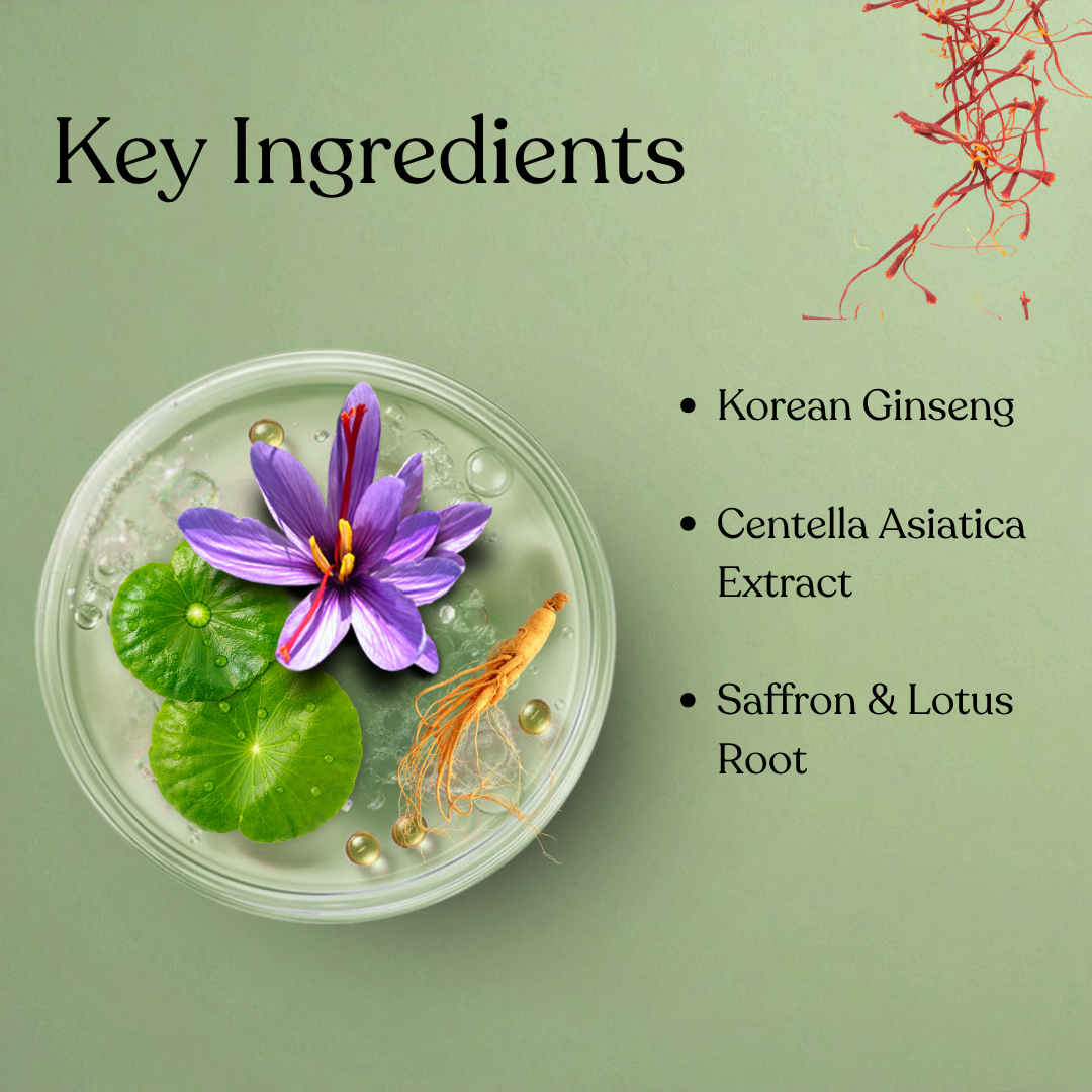 Water (Aqua), Glycerin, Ginseng Extract, Centella Asiatica Extract, Licorice Extract, emollients, humectants, and stabilisers. (Insert full INCI.)